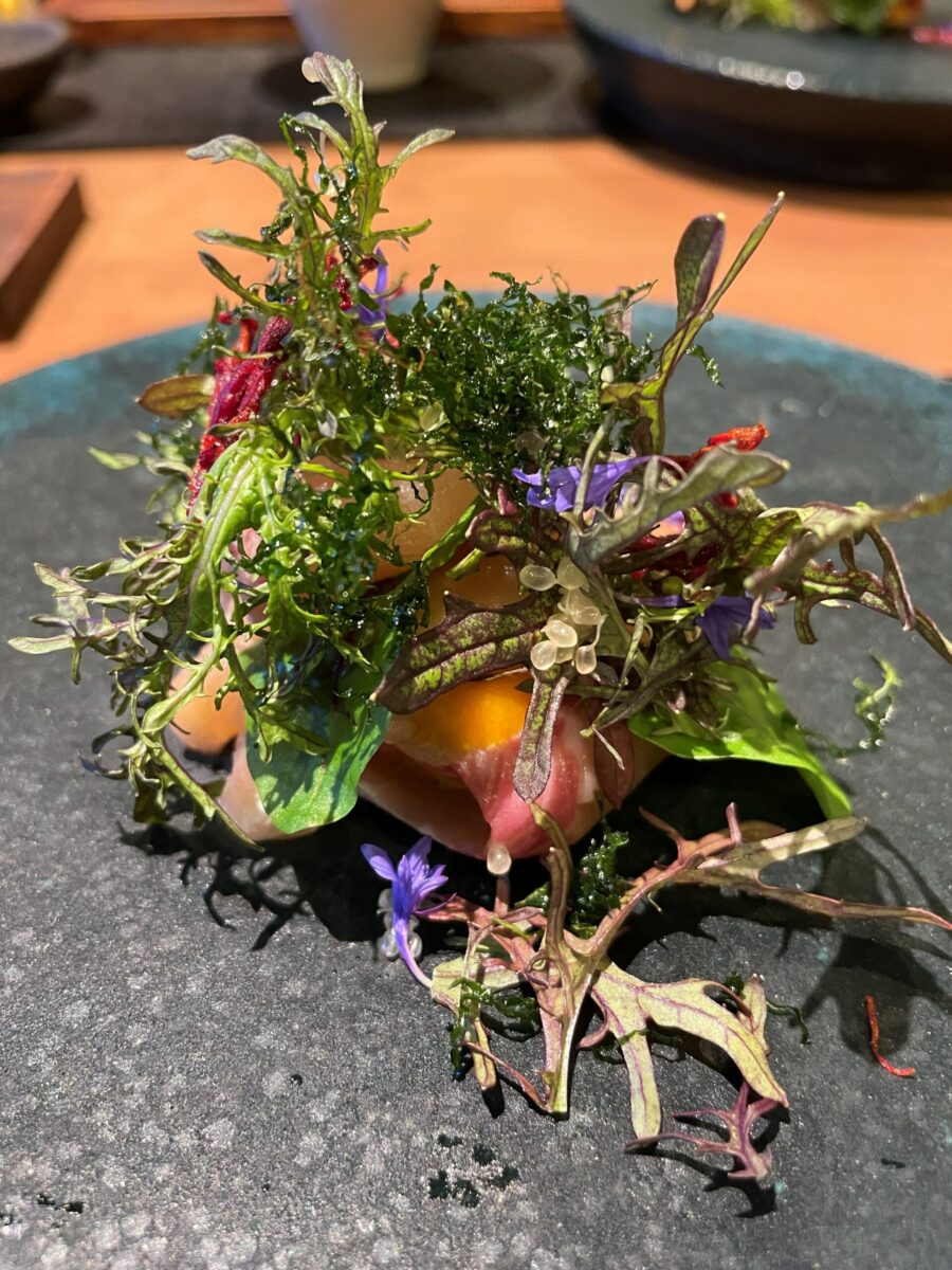 それにはきっと意味がある 2025.11.26 店主のつぶやき 写真のお料理はこう見えて和食です大王岩魚のお造り辛子水菜 大葉 ビーツ 卵黄 フィンガーライム全ての食材の味わいに意味があり美味しかった生ハム美味しいちゃんとした生ハムを食べる機会ってそうそうないからと 言ってくださりきちんとした食材を扱うことはやっぱり大切でお客さんにとっても意味があるんだなって改めて感じました