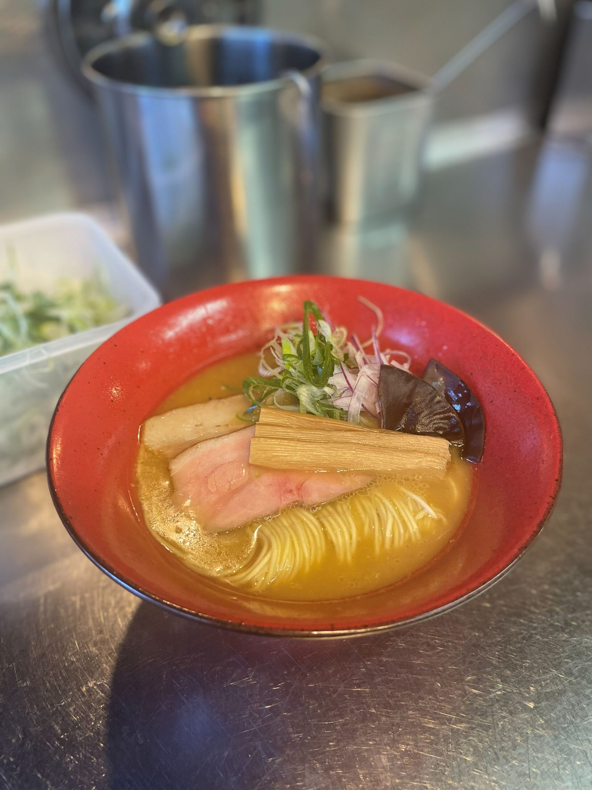 「もがみ鴨」と地鶏「真田丸」のスープに焼きあご干しと昆布の旨みをのせてバランスよく仕上げます。「霧島豚」チャーシューをトッピングしています。
